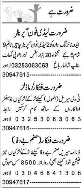 Vacant posts together with mannequin, girl cellphone operator, cellphone operator and actor are introduced in Personal Firm GT Street Lahore, lahore Punjab Pakistan as per 31 December 2025 commercial in day by day Categorical Newspaper. Most well-liked Schooling is Matric, Intermediate and Center and so on.