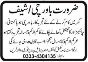 Dwelling Lahore, lahore Punjab Pakistan invitations functions from eligible candidates for the submit of chef and bawarchi as per commercial of March 10, 2026 printed in every day Jang Newspaper. Matric, Major and Center and so on. instructional qualification can be most well-liked.